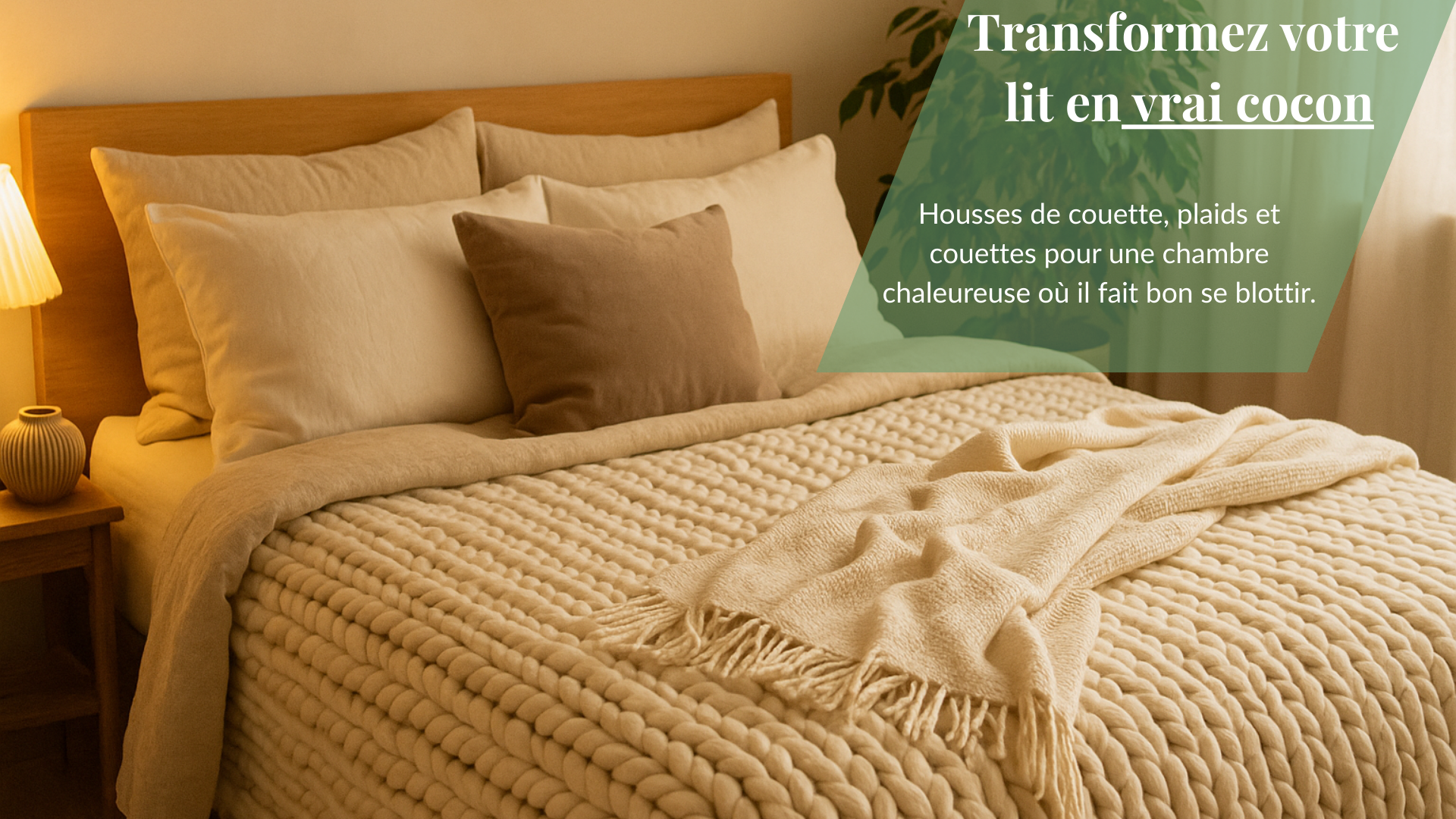 Cocon & Couette sélectionne pour vous des housses de couette, sets housse + taies, plaids et couettes cocooning, milieu et haut de gamme. Couleurs lin et vert sauge, matières douces et confort durable pour transformer votre chambre en refuge chaleureux. Un linge de lit cocooning premium, pensé pour des nuits reposantes, une déco apaisante et le plaisir de se glisser chaque soir dans un lit vraiment douillet, élégant et harmonieux, pour faire de votre chambre un véritable cocon de bien-être.